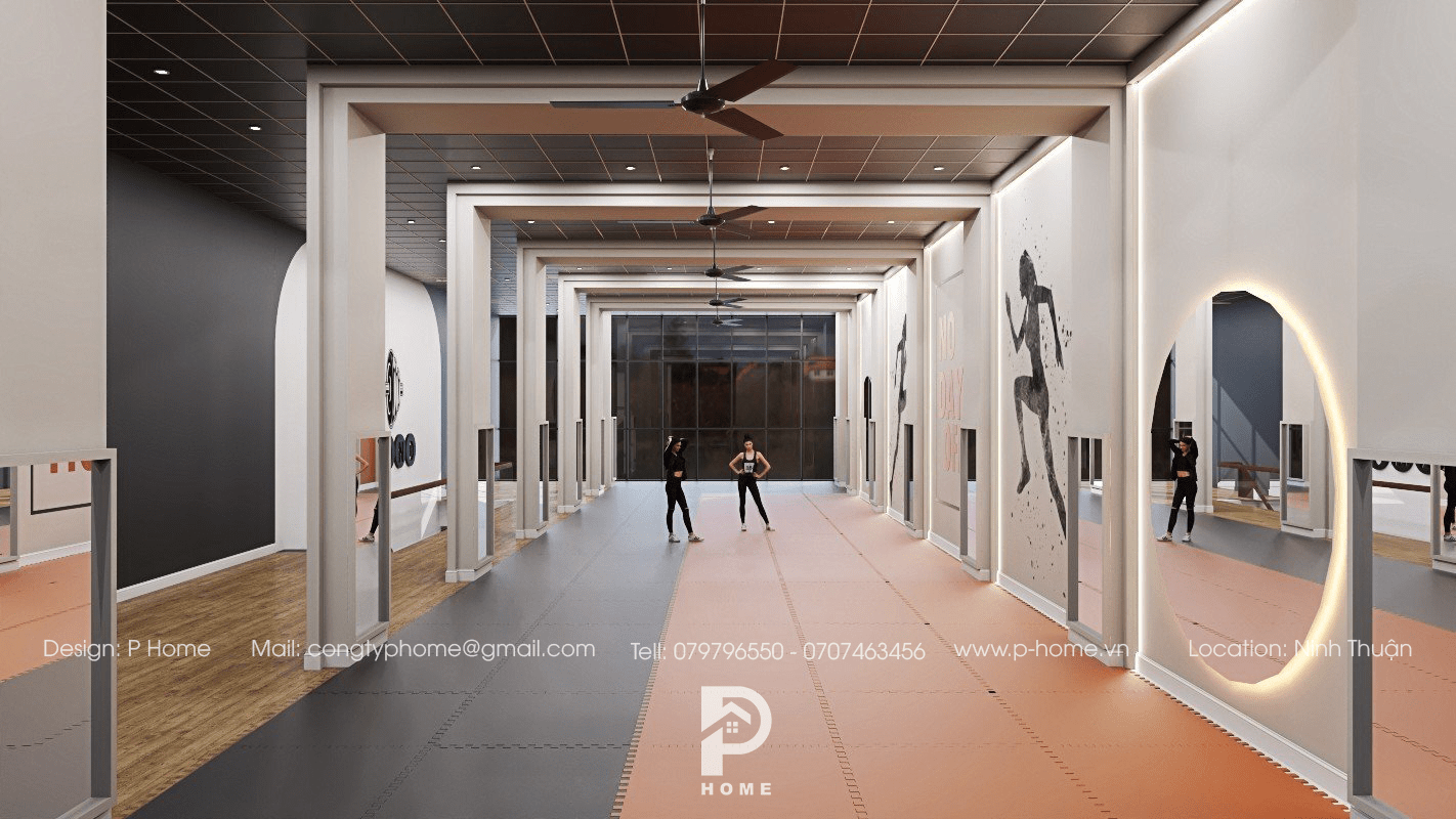 Bên cạnh đó thiết kế sử dụng gương phản chiếu giúp làm rộng không gian của phòng tập hơn.