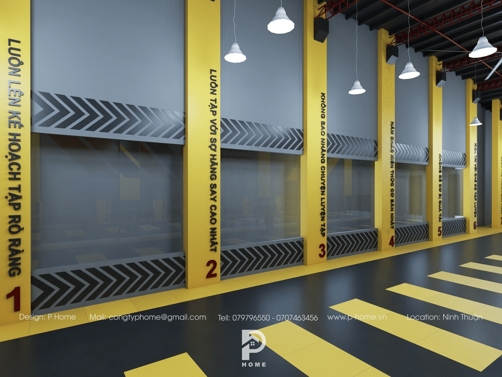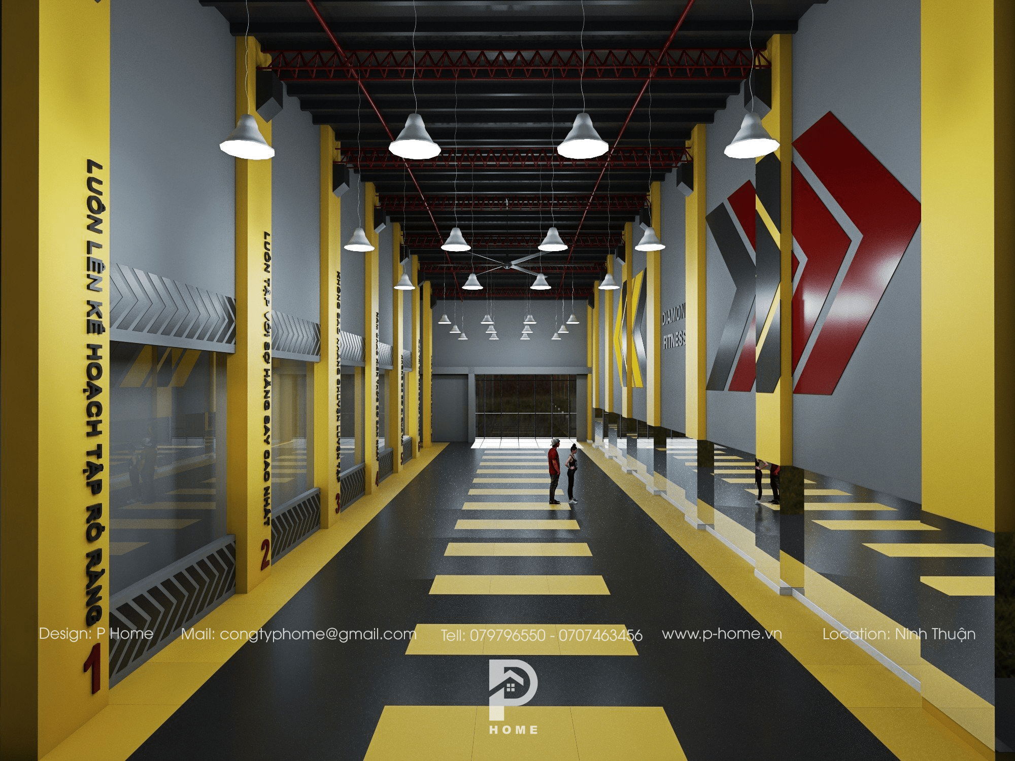 Tô điểm cho không gian phòng tập là màu cam, vàng, đen làm tăng sự hưng phấn cho học viên. Những phòng tập Gym với mô hình cá tính, năng động thường có sắc màu sáng mang lại cho người tập cảm giác trẻ trung hơn, thoải mái hơn khi tập luyện.