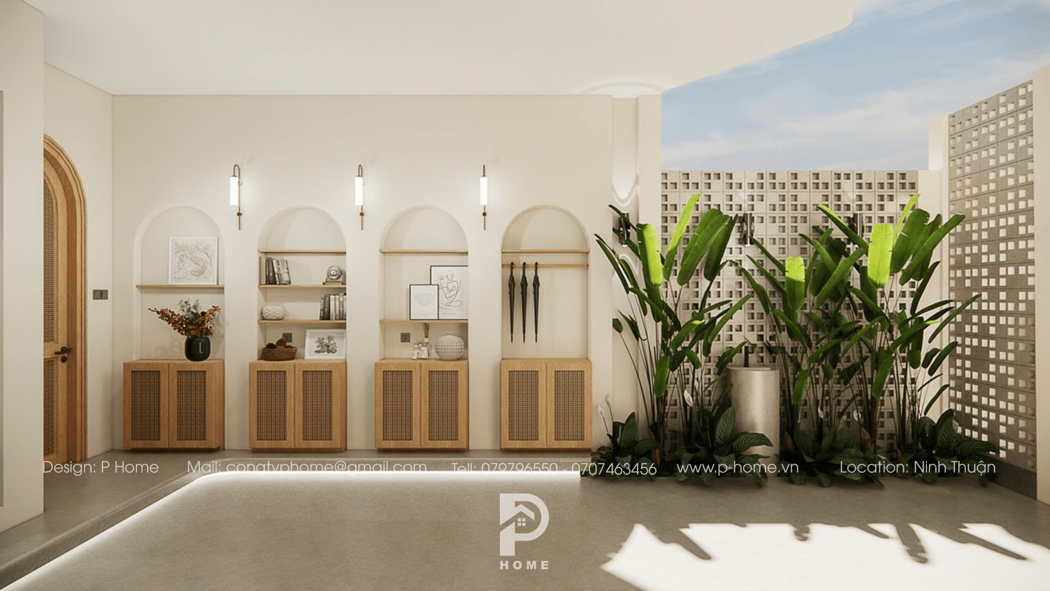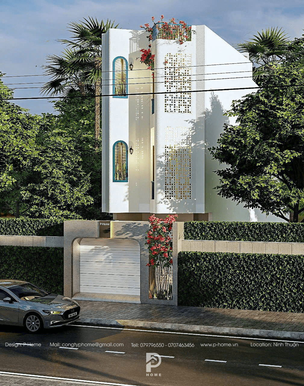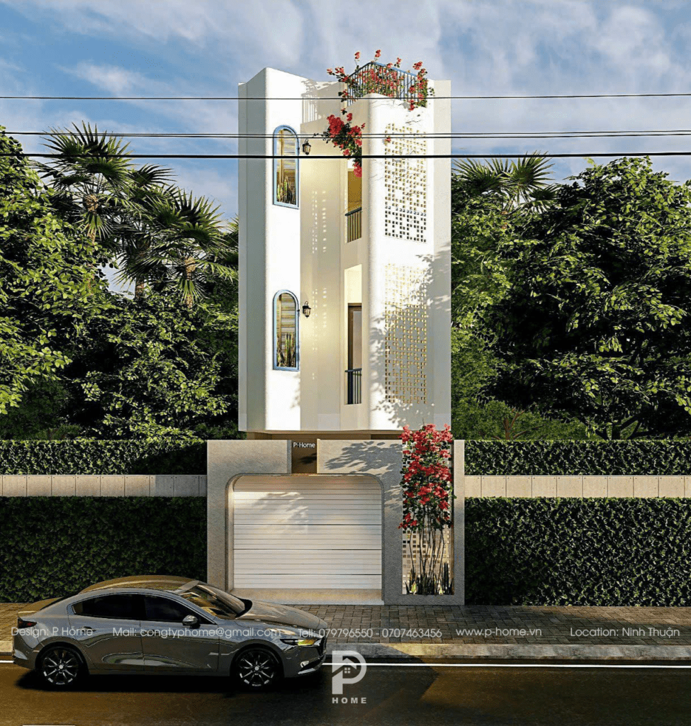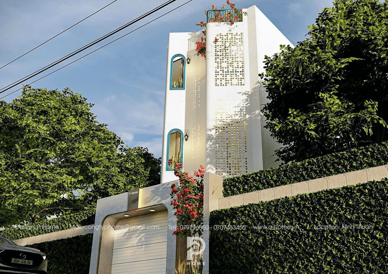 ???? Khuôn viên nhà hướng về phía đông sẽ rất nắng vào buổi sáng, cũng vì thế mà KTS đã khéo léo chọn tường bông gió vừa sử dụng tối đa công năng che chắn nắng vừa là nét trang trí đặc trưng cho căn nhà. Kết hợp cùng một vài nét phong cách Địa Trung Hải thêm phần sinh động cho “mái ấm”.